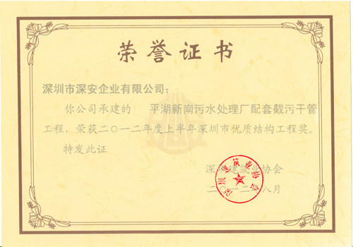 深安企業(yè)平湖新南污水處理廠配套截污干管工程獲優(yōu)質(zhì)結構工程獎
